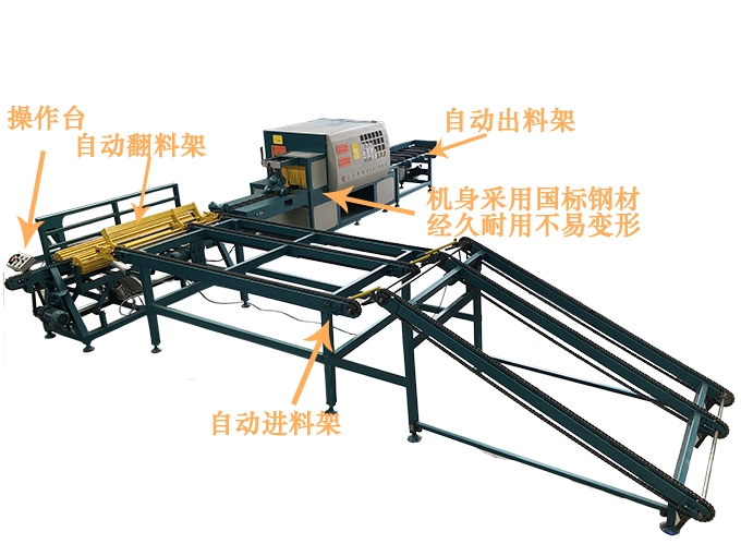 ZQ350型全自動原木多片鋸是針對原木鋸切而設計的專用機床,其主要特點與性能:帶自動進料架、自動出料架、自動翻料架,可自動進料、自動對中、自動出料、自動翻料,極大提高效率降低人力成本。采用五軸結構設計-前鋸后導航確保木板的精確度,無論木板長短均可保證鋸切木材尺寸公差在0.2mm-0.5mm之內,尺寸標準偏差小,節(jié)約木料,上下鋸軸,鋸片采用進口帶刮刀鋸片,鋸切表面光滑,無需再刨,保證不燒鋸片。采用自動分中裝置,提高木材的利用率;上壓輥主動增加壓力,送料平穩(wěn);采用軸心噴水冷卻鋸片,去脂降溫,增強鋸片的使用壽命。一次多片,大大提高工效;